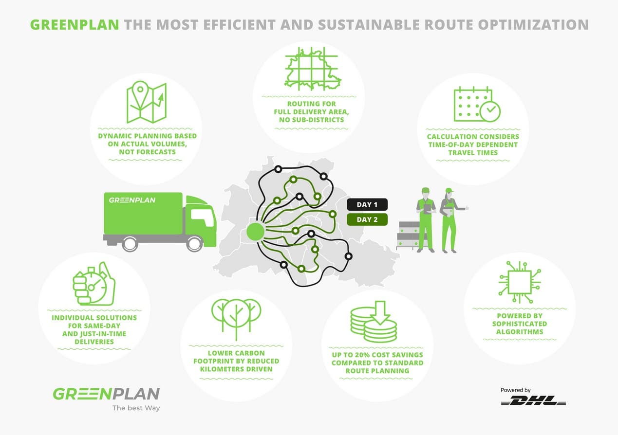 (Bonn) Greenplan, ein von DHL finanziertes Start-Up, führt einen leistungsfähigen Algorithmus zur Optimierung von Zustellrouten und Haltesequenzen in der Logistik ein. Der Algorithmus nutzt das volle Potenzial intelligenter Routenführung. Er verwendet alle verfügbaren Informationen und verfügbaren Daten, um die Transportrouten im gesamten Zustellbereich zu optimieren, während bestehende Lösungen aufgrund der Komplexität der Aufgabe nur kleinere Teilbereiche bearbeiten. Greenplan setzt damit neue Maßstäbe und unterstützt die Effizienz- und Nachhaltigkeits-anstrengungen der Branche, ohne bei der Planungsqualität Abstriche zu machen. Der Algorithmus wurde von Wissenschaftlern der Universität Bonn in Zusammenarbeit mit DHL-Logistikexperten entwickelt. Greenplan steht Kunden im Straßengüterverkehr und bei Lieferungen auf der letzten Meile sowie Außendienstlern bei der Umsetzung ihrer Servicepläne zur Seite.