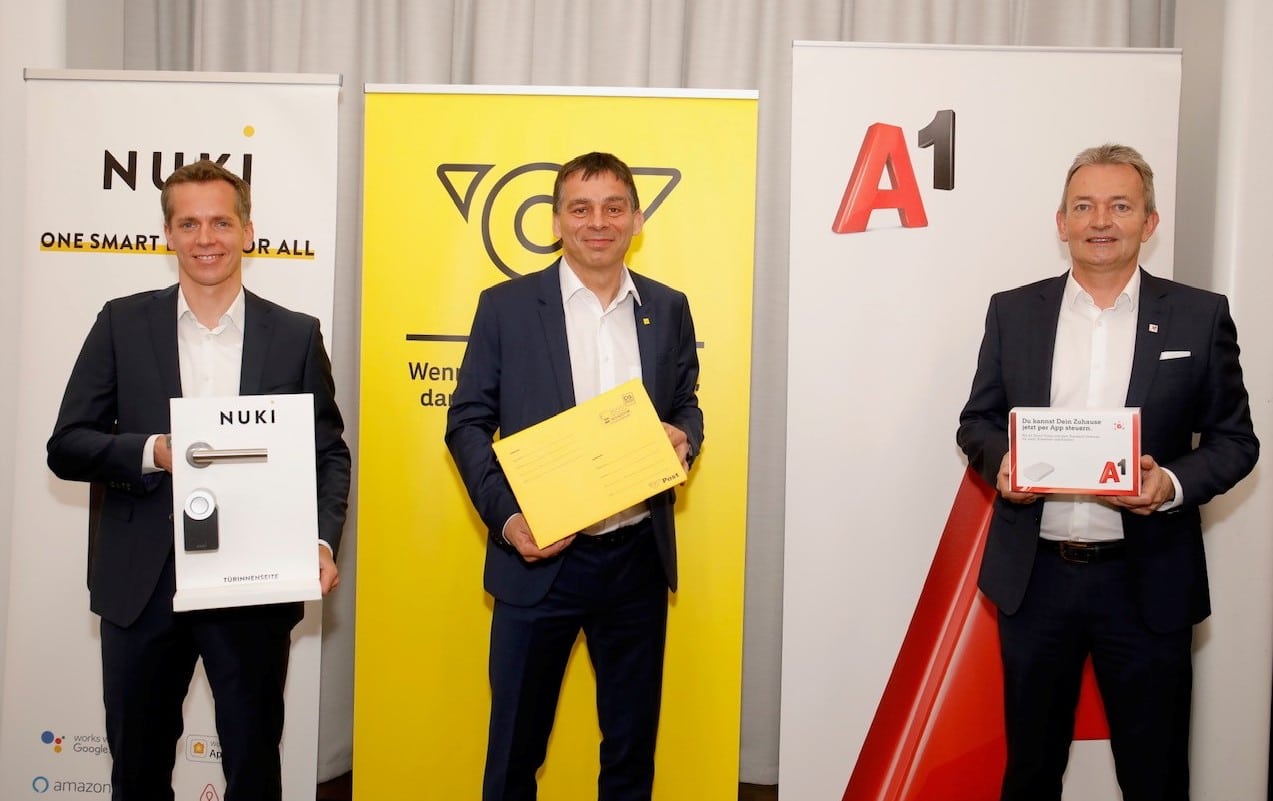 (v.l.n.r.): Mag. Martin Pansy, CEO der Nuki Home Solutions GmbH, DI Peter Umundum, Vorstand für Paket & Logistik, Österreichische Post AG, Marcus Grausam, CEO der A1 Telekom Austria AG (© Österreichische Post)