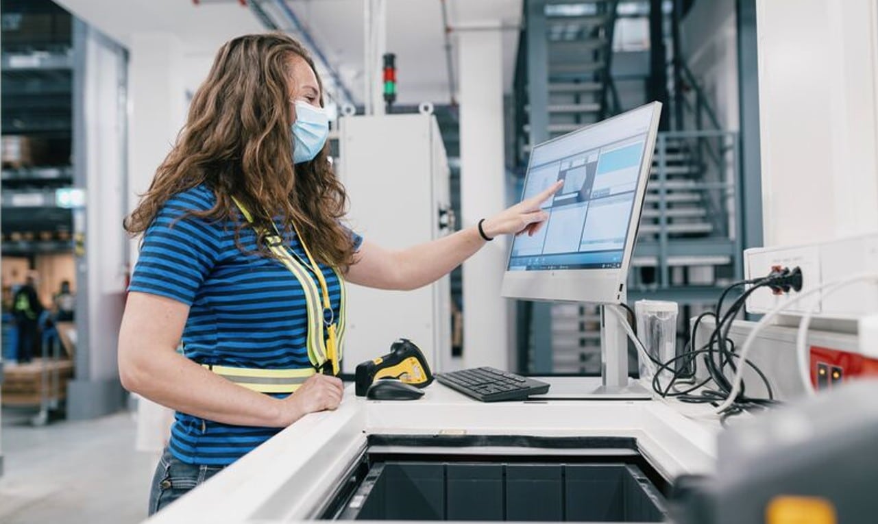 Foto: © Swisslog / Bildlegende: IKEA Mitarbeitende an der Ware-zu-Person Pickstation nutzen die Swisslog SynQ Warehouse Management Software.