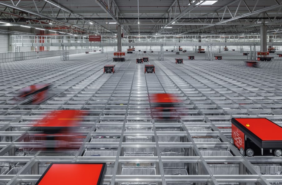 Das AutoStore ermöglicht eine platzsparende Lagerung und vollautomatische Kommissionierung der Artikel. Es besteht aus einem Aluminiumrahmen, in dem der aktuelle Warenbestand in 196.000 Kunststoffbehältern auf 16 Ebenen übereinander gestapelt und gelagert wird. Über den Behältern bildet der Aluminiumrahmen das sogenannte Grid, auf dem 160 Roboter die bestellten Waren vollautomatisch entsprechend den individuellen Bestellungen zusammenstellen. An 21 Ports wird die Ware dann durch die Mitarbeitenden weiterverarbeitet und für den Versand vorbereitet.
