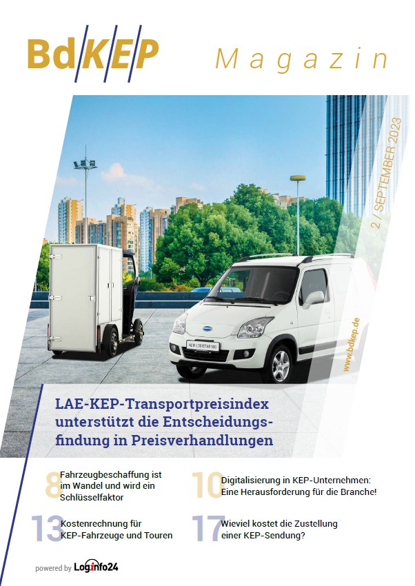23.09.2023 um 18:13 UhrDas neue BdKEP Magazin powered by Loginfo24 ist ab sofort lesebereit. Das Magazin ist nicht für Mitglieder des BdKEP interessant, sondern es beinhaltet Informationen rund um die KEP-Branche, die für alle Beteiligten informativ sind. Vorgestellt wird unter anderem der LAE-KEP-Transportpreisindex powered by BdKEP. Es gibt aber auch Tipps über die Fahrzeugbeschaffung, die Preisberechnung einer Route oder eines Paketes oder die Digitalisierung.