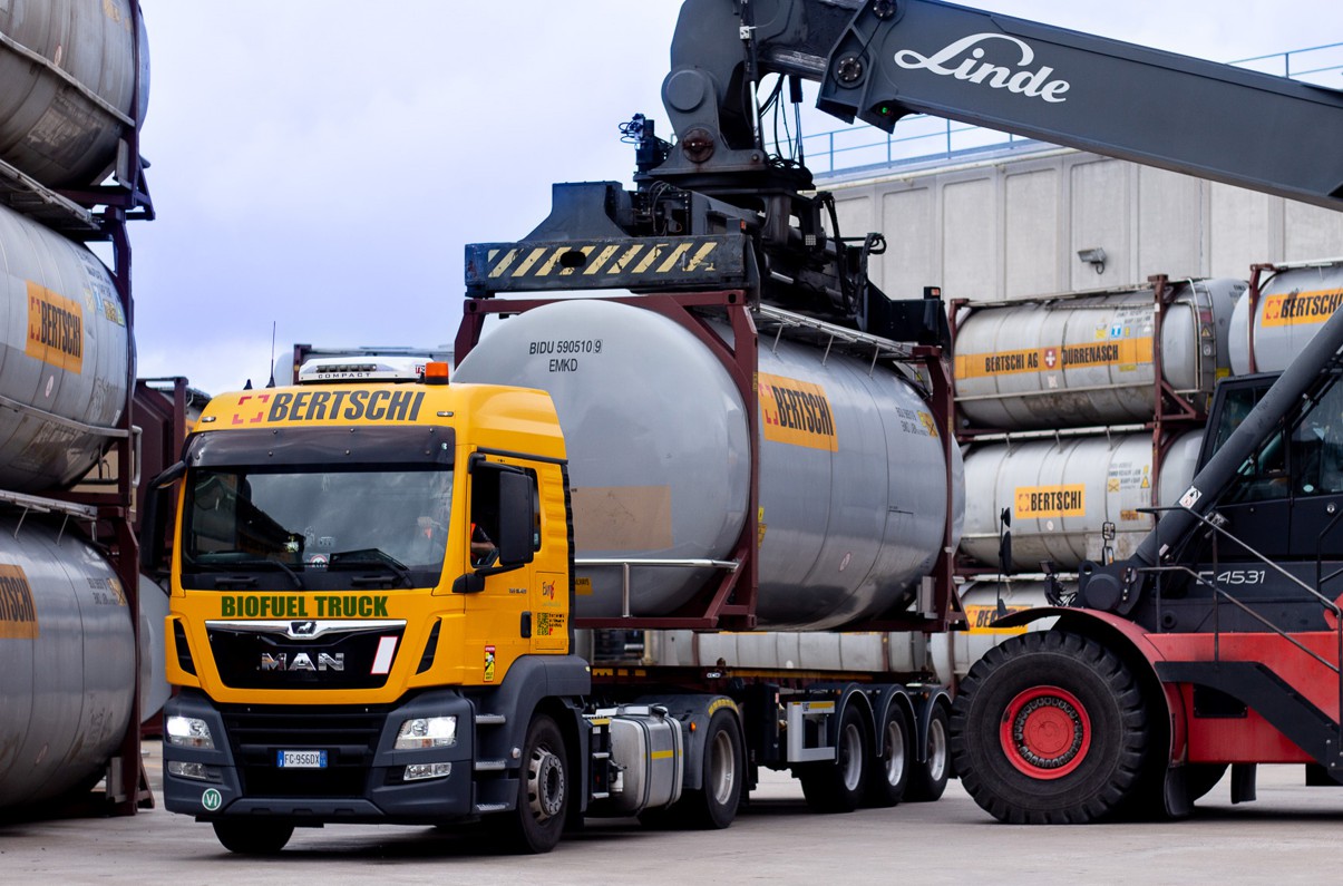 Mit innovativen Kunden-Pilotprojekten konnten 2023 durch die Verknüpfung von intermodalen Bahntransporten mit Lkw’s, die mit Biokraftstoffen betrieben werden, mehrere beinahe CO2-neutrale Tür-zu-Tür Lieferketten quer durch Europa realisiert werden. Bertschi wickelt bereits heute 90% aller europäischen Landtransporte über den intermodalen Schienenverkehr ab und reduziert damit die CO2-Emissionen jährlich um 230’000 Tonnen. Der Schwerpunkt bei diesen Projekten lag bei der Optimierung der ersten und letzten Meile der Lieferkette, welche auf der Strasse abgewickelt werden. Dabei kommt hydriertes Pflanzenöl (HVO) als Treibstoff zum Einsatz, mit welchem sowohl die Terminalfahrzeuge wie auch die Lkw‘s betrieben werden. Damit lassen sich die CO2- Emissionen im Vergleich zum herkömmlichen Strassentransport um bis zu 90% verringern. Nach diesen erfolgreichen Umsetzungen soll das Konzept auf weitere Lieferketten ausgeweitet werden. Das sind wichtige Schritte der Bertschi Gruppe, um bis 2050 CO2-neutral zu produzieren.