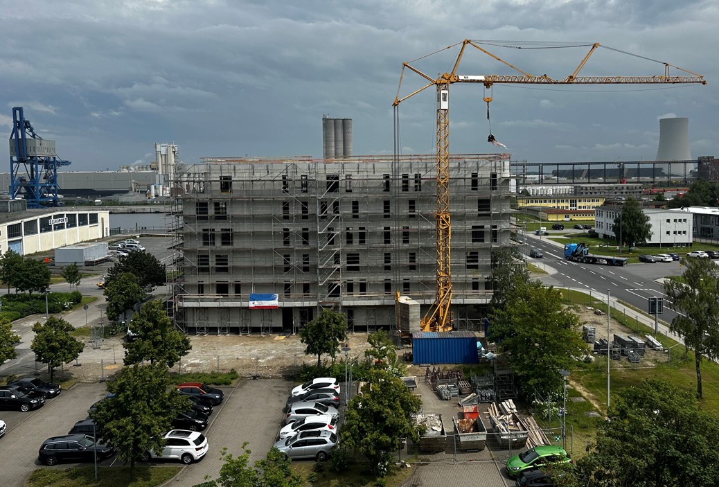 30.05.2024 um 17:15 UhrRichtfest für ein neues Bürogebäude an der Ost-West-Straße im Überseehafen Rostock. Am Fuße von Pier II in unmittelbarer Nähe zu den Bürogebäuden des Hafenbetreibers ROSTOCK PORT und Umschlagunternehmens Euroports entsteht bis zum Jahresende 2025 ein sechsgeschossiges Gebäude mit 60 Büroräumen und einer Nutzfläche von 2.520 Quadratmetern.