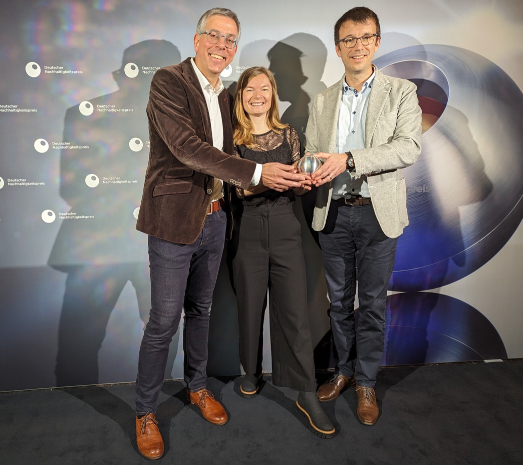 Foto: © allsafe / Bildlegende (v.l.n.r.): Freuen sich über die Auszeichnung: Geschäftsführer Jens Laufer, Nachhaltigkeitskommunikatorin Ina-Faye Bartikowski und Produktmanager Matthias König