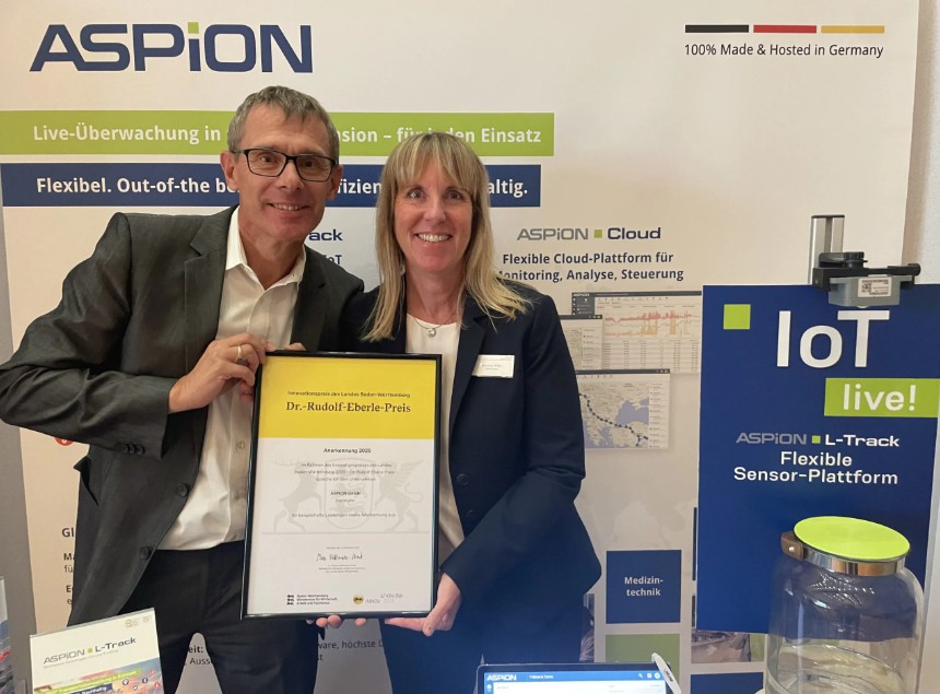 Die Aspion GmbH aus Karlsruhe wurde mit ihrem IoT- Multisensor Datenlogger ASPION L-Track mit dem Innovationspreis Baden-Württemberg 2025 – Dr.-Rudolf-Eberle-Preis ausgezeichnet. Damit gelingt es dem Unternehmen bereits zum zweiten Mal in nur vier Jahren mit einer marktreifen Innovation die Jury zu überzeugen.