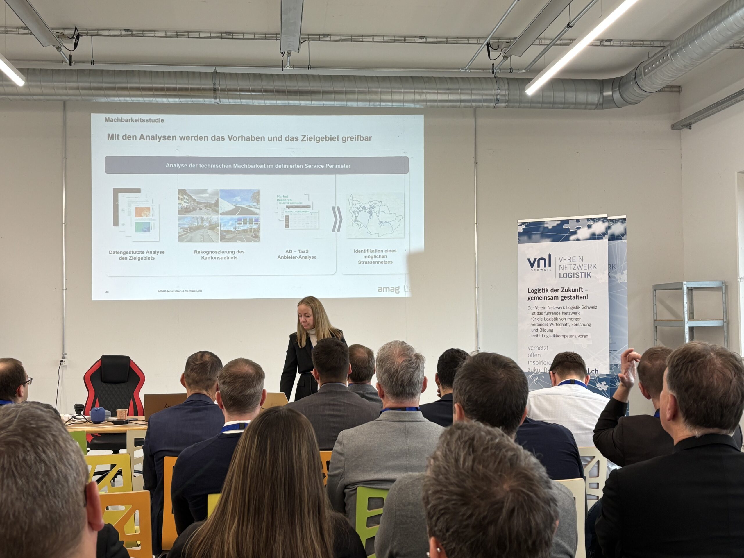 Gleich zu Beginn setzte die Keynote von Anna Chirkova (AMAG Innovation & Venture LAB) ein klares Zeichen: autonome Gütertransporte werden Realität. Die Schweiz verfügt seit März 2025 über einen stabilen Rechtsrahmen für automatisiertes Fahren, die sogenannte VAF-Verordnung. Dies eröffnet neue Möglichkeiten für Projekte von Drohnen über urbane RoboVans bis hin zu langfristigen Hub-to-Hub-Transporten. Erste Fahrzeuge sollen ab 2026/27 typgenehmigt verfügbar sein. Besonders betont wurde, dass nicht die autonome Fahrzeugtechnik das Hauptproblem sei – sondern die Transformation der bestehenden Logistikprozesse, insbesondere an Be- und Entladestellen.