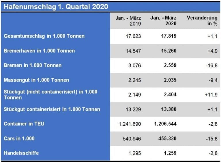 (Bremen) The Bremen ports were able to increase their total throughput in the first quarter of this year by 1.1 percent to 17.8 million tons compared to the same period last year, despite the already beginning Corona crisis. Particularly, the export business rose by 4.7 percent to 9 million tons. There were also increases in the general cargo throughput by 2.6 percent (15.8 million tons), while non-containerized general cargo increased by 11.9 percent (2.4 million tons). The container throughput was relatively stable in the first three months with a slight decrease of 2.8 percent (1.2 million TEU).