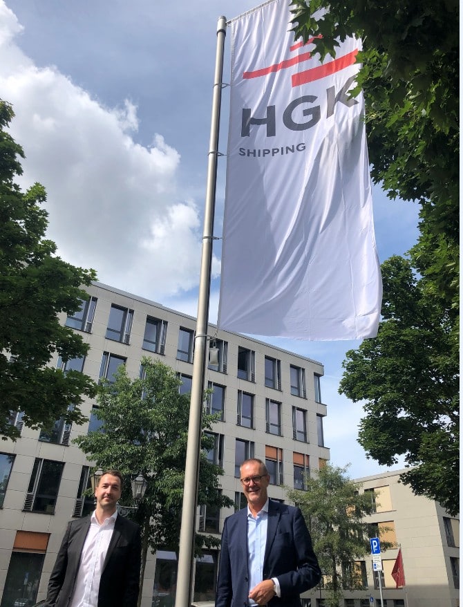 Photos: © HGK / Photo 1: The new HGK logo flutters in the wind / Image 2: HGK Board Member Uwe Wedig (on the right) and HGK Shipping Managing Director Steffen Bauer (on the left) raise the new company flag in front of the operational headquarters of HGK Shipping GmbH in Duisburg Ruhrort.