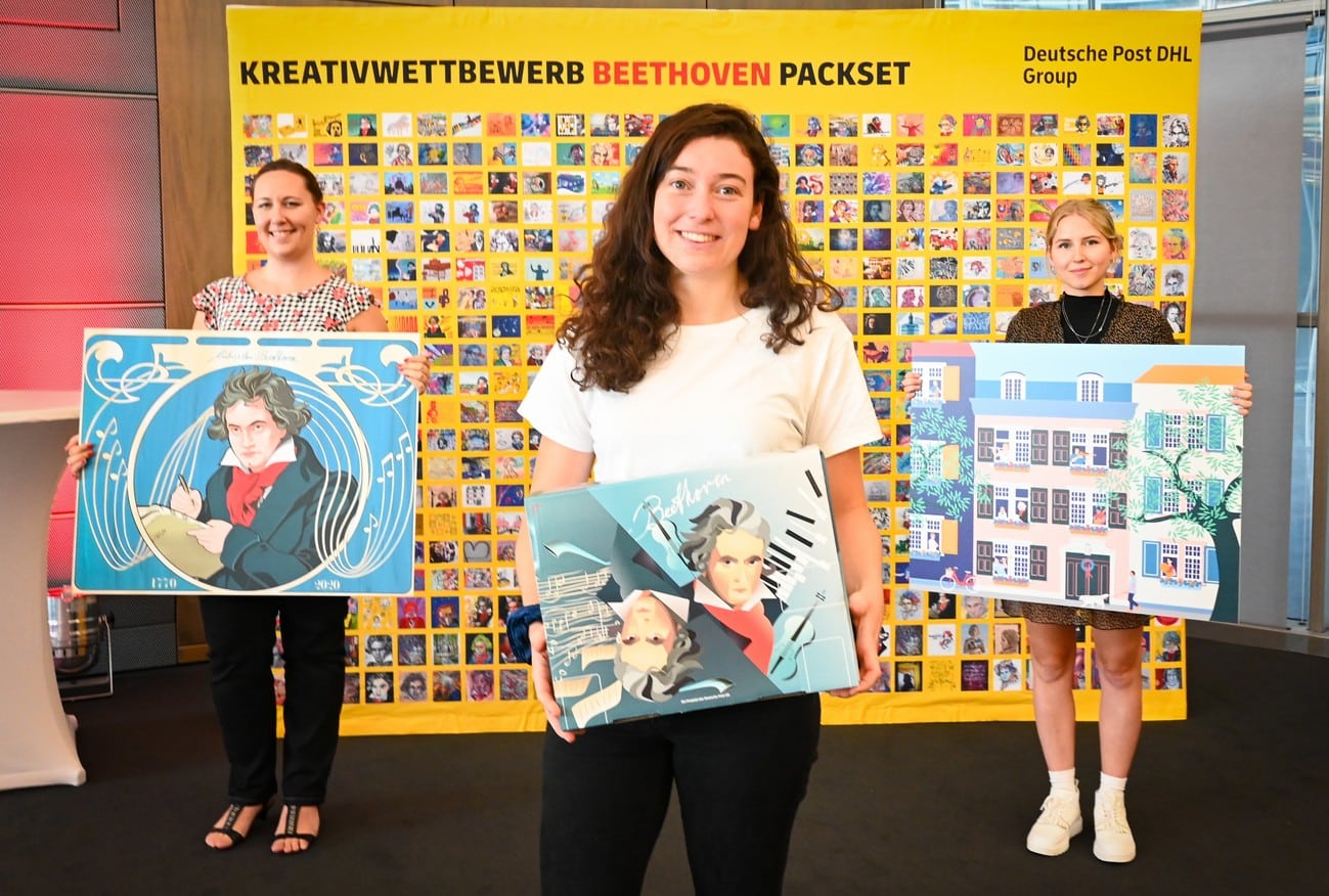 The winning designs were selected by a four-member jury consisting of Monika Schaller, Executive Vice President Corporate Communications, Sustainability & Brand at Deutsche Post DHL Group, Malte Boecker, Director of the Beethoven House Bonn, Jens Mohr, freelance artist, and Jutta Frankenberg, product manager for the pack sets at Paket. “The call from Deutsche Post DHL Group to creatively engage with Beethoven during the Corona period received an incredible response with over 600 submissions,” says Malte Boecker. “The jury placed value on artistic quality and originality as well as on the assessment of whether they would look good on a pack set and inspire interest in Beethoven. The selection was not easy for us given the many great designs. I am even more pleased that we were able to agree on three particularly harmonious winning designs and about the pack set that will carry the image of Beethoven and his music around the world in time for Beethoven’s 250th birthday.”