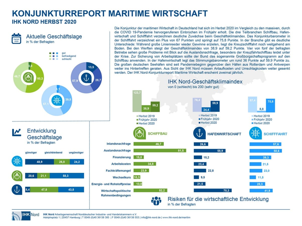 Dec 15, 2020 at 7:18 PMAn economic survey by IHK Nord in the maritime industry showed a significant recovery in shipbuilding, port operations, and shipping. However, the figures are still below last year’s level. The goods shipping sector showed the strongest recovery.