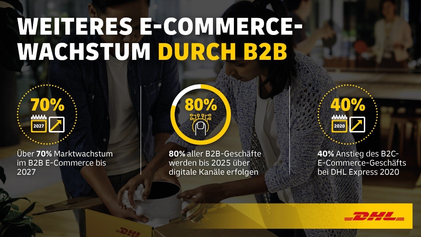 (Bonn) DHL Express today presented a new white paper titled “The Ultimate B2B E-commerce Guide: Tradition is out. Digital is in.” The study predicts strong growth for the global B2B e-commerce market in the coming years: by 2025, 80 percent of all B2B transactions between suppliers and professional buyers will occur through digital channels. The main drivers of global e-commerce growth are the accelerated digitalization resulting from the Covid-19 pandemic and the fundamentally changed purchasing behavior of the tech-savvy Generation Y, which now predominantly shapes professional purchasing decision processes in companies. The future development of the B2B sector is already reflected in the strong increase in B2C e-commerce over the past years. DHL Express has recorded enormous growth rates, especially during peak seasons such as Easter and Christmas, as well as on mega shopping days like “Black Friday” or “Cyber Monday.” Overall, this led to a 40 percent increase in e-commerce shipment volumes in the B2C business within the global DHL Express network last year.