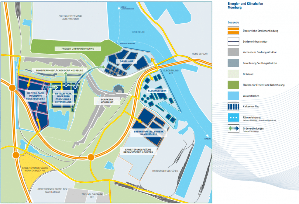 The plans of the Hamburg Chamber of Commerce aim to make Moorburg a center for research and development, renewable energies, green hydrogen, alternative fuels, and fuel cell technology. With a Hy-Tech Park, an E-Fuel Hub, and a fuel cell plant, approximately 153.6 hectares are to be newly utilized, creating around 6,400 new jobs. At the same time, this concept offers the village of Moorburg a new perspective as a district with a better quality of life for its residents.