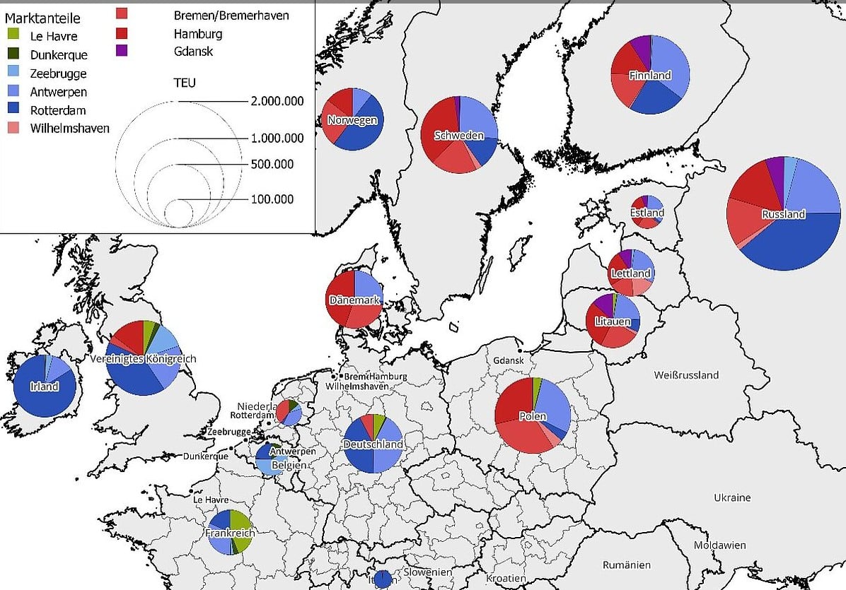 (Bonn) Based on data from the “Container Traffic Model Europe” of ISL, the individual market segments (transshipment and intra-European shortsea traffic, also known as “shortsea-land”) were analyzed by sailing areas. Relevant competitive ports were also taken into account.
