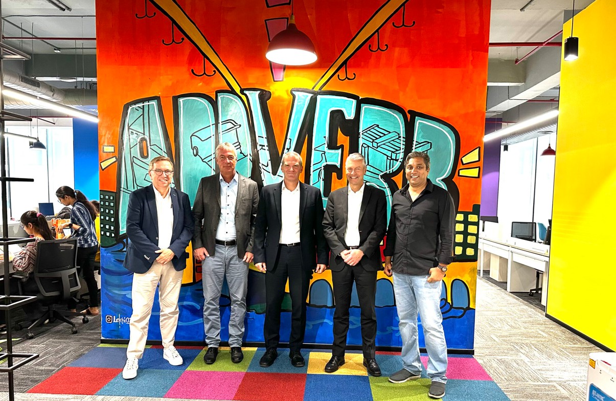 Photo: © Kardex / Image caption (l. to r.): Pieter Feenstra – CEO Addverb EMEA, Dr. Volker Jungbluth – Head of Corporate Technology Kardex, Dr. Jens Hardenacke – CEO Kardex, Daniel Hauser – Managing Director Kardex AS Solution, Sangeet Kumar – CEO Addverb