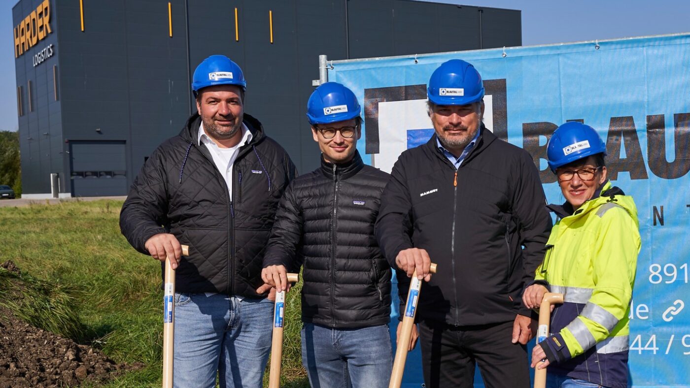 Photo: © Harder / Image caption (l. to r.): The groundbreaking by Marcello Danieli, Johannes Danieli (both HARDER logistics), Alexander Müller, and Susanna Haringer (both Blautal construction company) symbolizes the beginning of the new construction