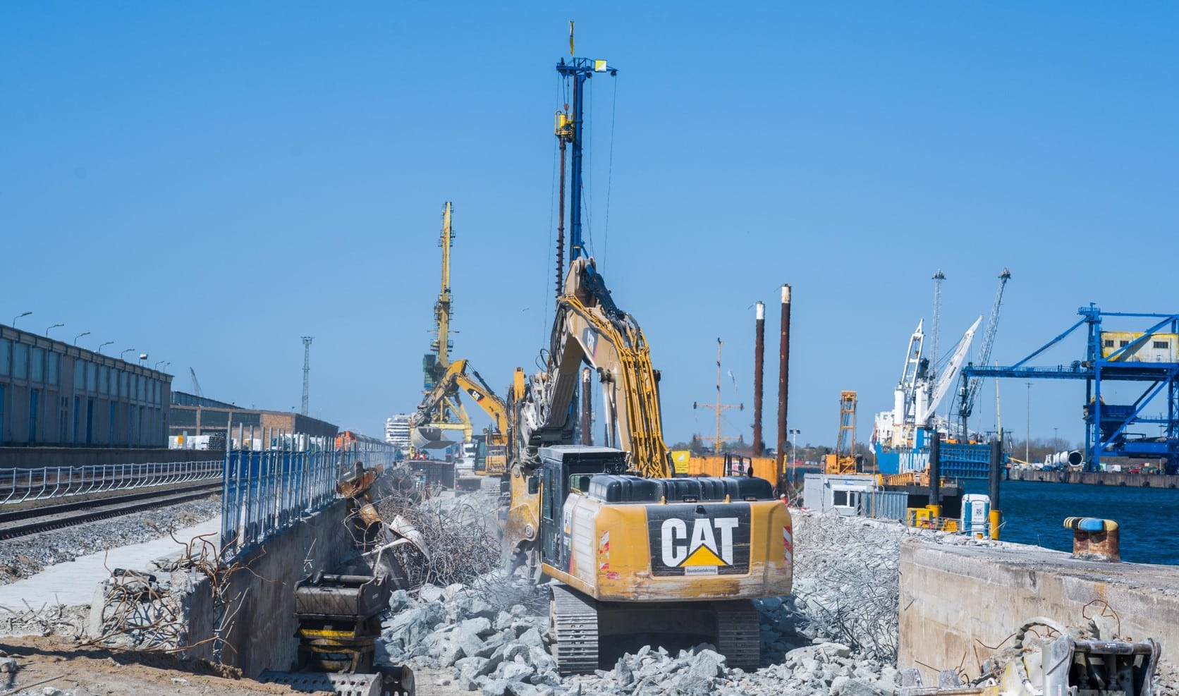 «Los muelles 31 y 32, de 62 y 58 años de antigüedad, en el lado este del muelle II en la cuenca del puerto B, se construirán de nuevo en una longitud total de 400 metros, un ancho de 18 metros y una profundidad de agua de 12,50 metros», dice Jens Scharner, director general de ROSTOCK PORT GmbH. Para ello, se desmantelarán y eliminarán aproximadamente 12,000 metros cúbicos de hormigón, material de relleno y acero. Con la ayuda de 650 perforaciones de aflojamiento, la nueva y pesada pared de pilotes de acero, que pesa un total de 3,200 toneladas, se hincará en varias partes hasta 27 metros de profundidad en el lecho del puerto. 245 pilotes de hasta 37 metros de longitud anclarán la nueva pared de pilotes en diagonal con el terreno de construcción. La instalación del muelle estará diseñada para una capacidad de carga de cinco toneladas por metro cuadrado y estará equipada a lo largo de toda su longitud con nuevas vías de grúa que pueden soportar una carga de 30 toneladas por metro. La ejecución de la construcción está a cargo de una asociación de trabajo compuesta por las empresas de construcción Züblin AG de Rostock y Tiefbau GmbH Unterweser de Oldenburg.