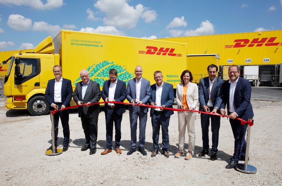 Foto: © Deutsche Post DHL Group / Descripción de la imagen: de izquierda a derecha: Tim Scharwath, CEO de DHL Global Forwarding, Freight, Uwe Brinks, CEO de DHL Freight, Thorsten Stolz, alcalde del distrito de Main-Kinzig, Gero Schiffelmann, miembro de la dirección de DHL Freight Alemania, Stefan Erb, alcalde de Erlensee, Sylvia Braun, alcaldesa de Bruchköbel, Götz Hanningsmann, director de DHL Freight Erlensee, Thomas Vogel, CEO de DHL Freight DACH