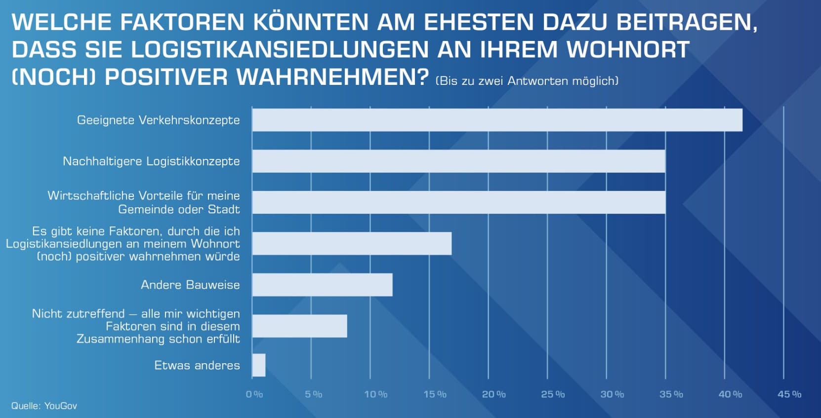 «La encuesta muestra que, con buenos y sostenibles conceptos, hay una aceptación para la logística. Una población que, en promedio, es neutral hacia los bienes raíces logísticos puede ser convencida con buenos argumentos», resume Neumeier y hace un llamado a las municipalidades: «No se cierren de manera fundamental a nuevos asentamientos logísticos, pero exijan a las empresas compromisos concretos y compromisos en relación con conceptos de tráfico, sostenibilidad, rentabilidad o tipo de construcción.» Al final, todos se benefician: municipalidades, empresas logísticas, población y la economía en general. Porque la seguridad de suministro de bienes es esencial, y esto es algo que la población, como confirma la encuesta, es muy consciente.