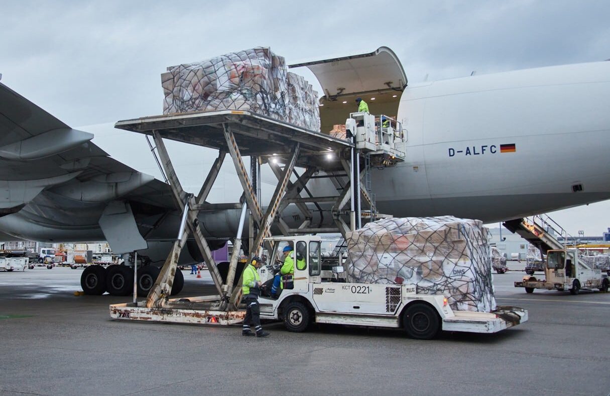 Foto: © Lufthansa Cargo / Pie de foto: Carga de artículos de ayuda en el aeropuerto de Fráncfort