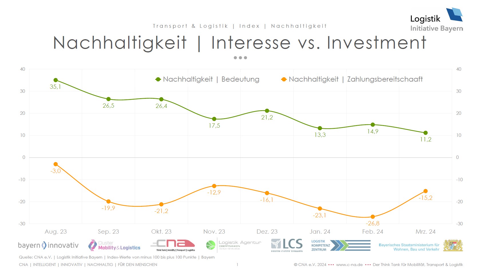 El índice de sostenibilidad se determina en el marco del Barómetro Logístico de Baviera. La encuesta a expertos de la industria de transporte y logística de Baviera ya había consultado en los últimos ocho meses la evaluación de los expertos sobre la importancia y la disposición a pagar por el tema. «El índice de sostenibilidad de los últimos meses muestra claramente que, dado los desafíos económicos como el aumento de los precios del CO2 a principios de año, también disminuye la importancia del tema de la sostenibilidad en el transporte y la logística», señala el Dr. Rudolf Aunkofer | Director General de CNA e.V. «Desafortunadamente, se puede observar lo que ya se conoce en otros contextos: una alta carga de costos hace que la rentabilidad o la competitividad de las empresas y los clientes se conviertan en la prioridad, lamentablemente a expensas de la sostenibilidad. Una mayor carga de costos, como la peaje de camiones, puede así llevar por primera vez a efectos opuestos en la práctica. La visión de una logística verde debe seguir siendo asequible.»