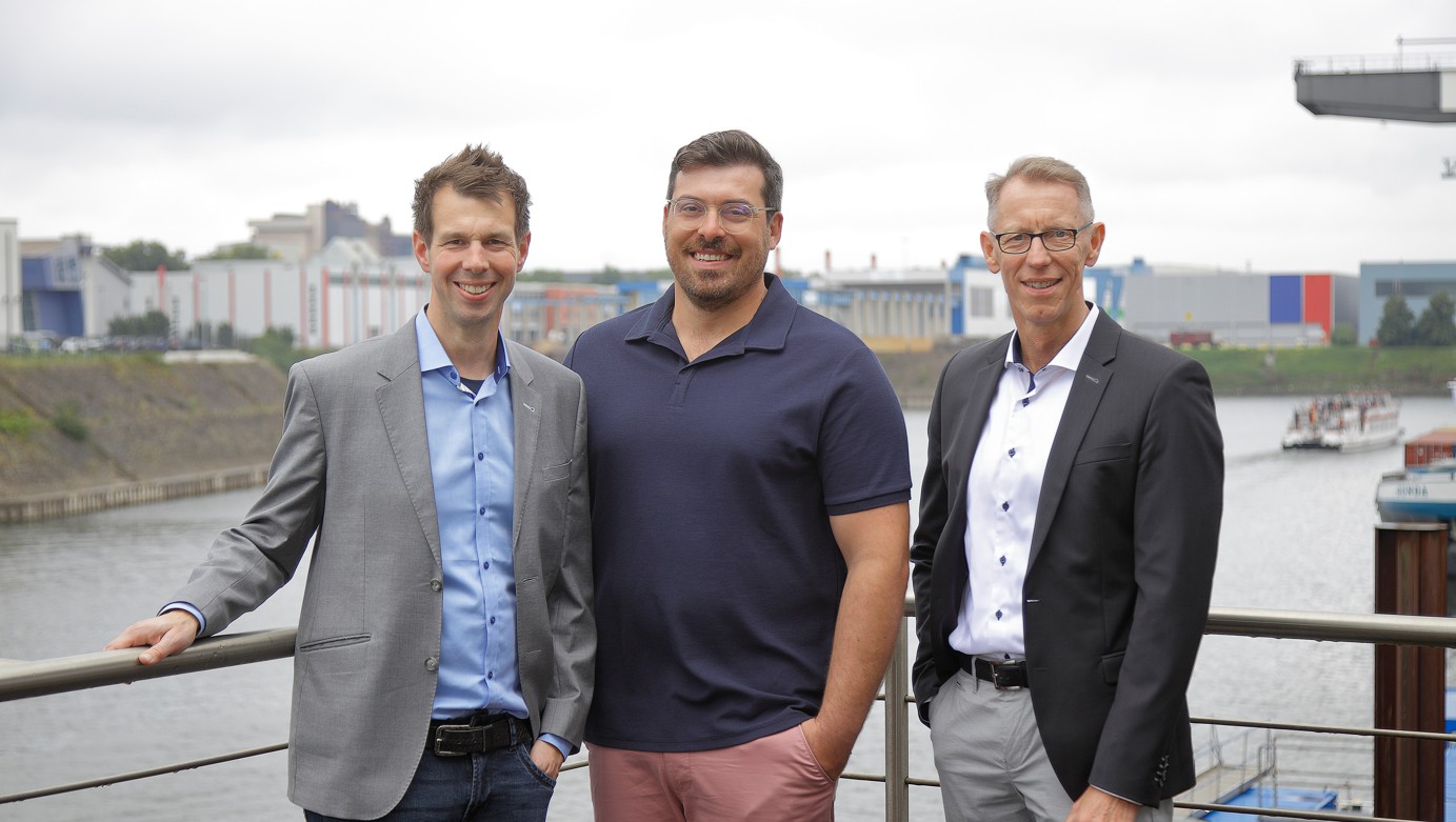 Foto: © Rheinports / Descripción de la imagen: El actual director general de RheinPorts, Felix Harder (izquierda), impulsará junto con Aurel Wernli y Joachim Holstein (derecha) la transformación digital de la navegación interior