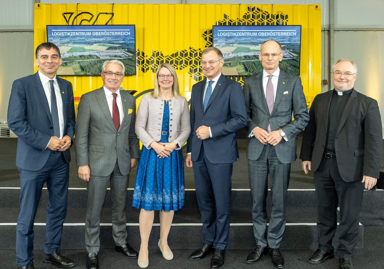 DI Peter Umundum, direttore del consiglio per pacchi e logistica, Österreichische Post AG, DI Dr. Georg Pölzl, direttore generale, Österreichische Post AG, Jutta Enzinger, sindaco del comune di Allhaming, Mag. Thomas Stelzer, governatore dell’Alta Austria, DI Walter Oblin, direttore generale aggiunto, membro del consiglio per la posta e le finanze, Österreichische Post AG, Ehrenkan. Univ.-Prof. DDr. Severin Lederhilger OPraem (© Österreichische Post AG)
