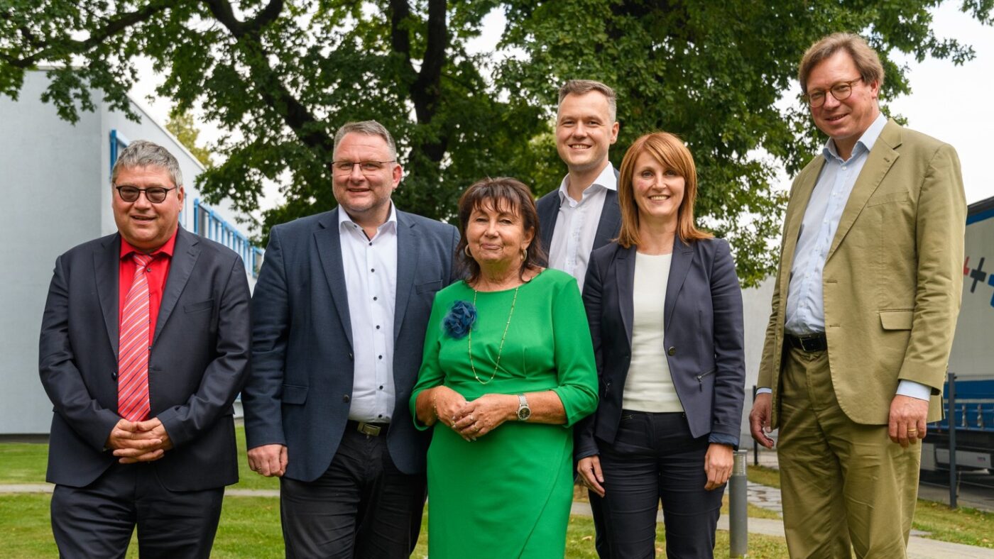 Foto: © WP Holding / Didascalia dell’immagine: Il vertice della frazione CDU del parlamento sassone in visita a WP (da sinistra: Dr. Matthias Schmidt, amministratore delegato di Erlos, Christian Hartmann, presidente della frazione CDU Sassonia, Kerstin Nicolaus, MdL, Jan Löffler, MdL, Doreen Paesold-Runge, amministratore delegato di WP Holding, Georg-Ludwig von Breitenbuch, MdL)
