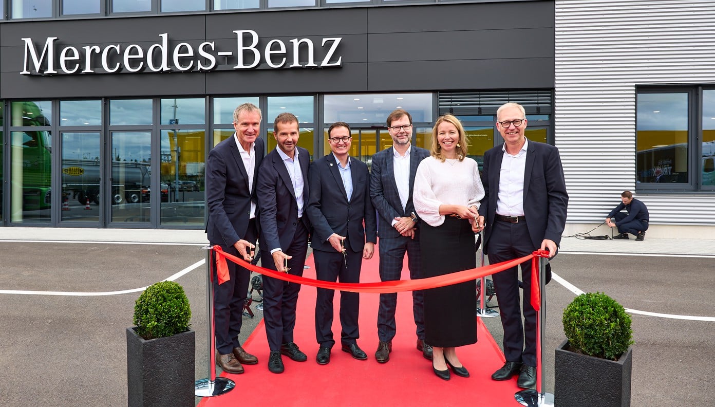 Foto: © Mercedes-Benz Trucks / Legenda immagine di copertura (da sinistra a destra): Markus Mitterhusen, responsabile del centro veicoli commerciali Mercedes-Benz München-Aschheim, Achim Puchert, CEO di Mercedes-Benz Trucks, Florian Meier, sindaco del comune di Aschheim, Thomas Gloßner, direttore ministeriale, Ministero bavarese per l’abitazione, la costruzione e i trasporti, Stina Fagerman, responsabile marketing, vendite e servizi di Mercedes-Benz Trucks, Volker Hüntrup; responsabile di Mercedes-Benz Trucks Own Retail, Europa