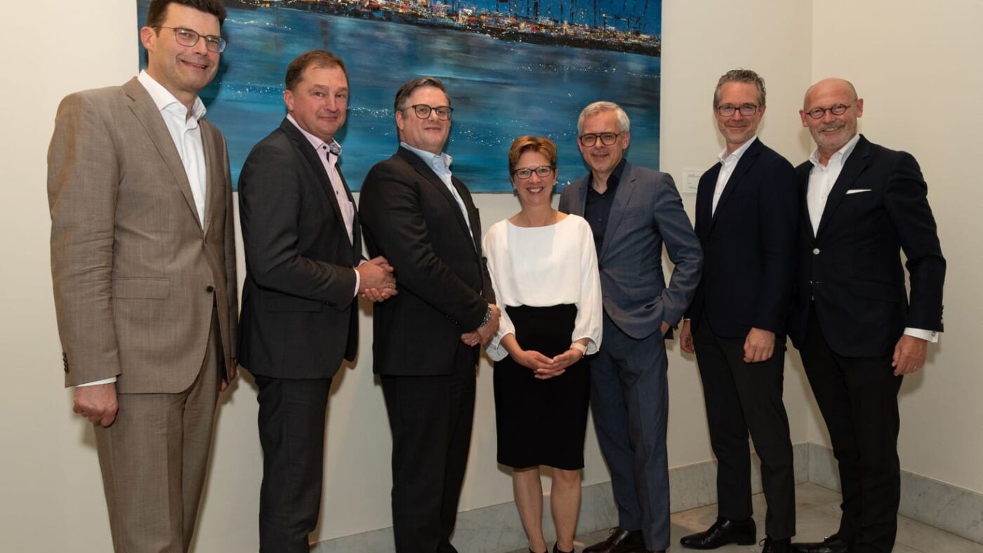 Foto: © Hafen Hamburg Marketing e.V. / Bijschrift: (v.l.n.r.) Lutz Könner (Zentralverband der deutschen Seehafenbetriebe e.V.), Kay Lohse (Deutsches Seeverladerkomitee im Bundesverband der Deutschen Industrie e.V.), Dr. Alexander Geisler (Verband Hamburger und Bremer Schiffsmakler e.V.), Dr. Claudia Schilling (Senatorin für Wissenschaft und Häfen der Freien Hansestadt Bremen), Oliver Detje (DVV Media Group GmbH), Dr. Berend Lindner (Staatssekretär Niedersächsisches Ministerium für Wirtschaft, Arbeit, Verkehr und Digitalisierung) Michael Westhagemann (Präses der Behörde für Wirtschaft und Innovation Freie und Hansestadt Hamburg)