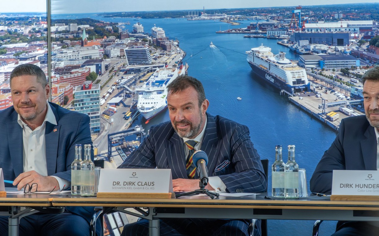 Foto: © Haven van Kiel / Bijschrift (v.l.n.r.): Mikko Juelich (directeur van Stena Line Duitsland), Dr. Dirk Claus (directeur Haven van Kiel) en directeurColor Line GmbH) tijdens de jaarpersconferentie van SEEHAFEN KIEL GmbH