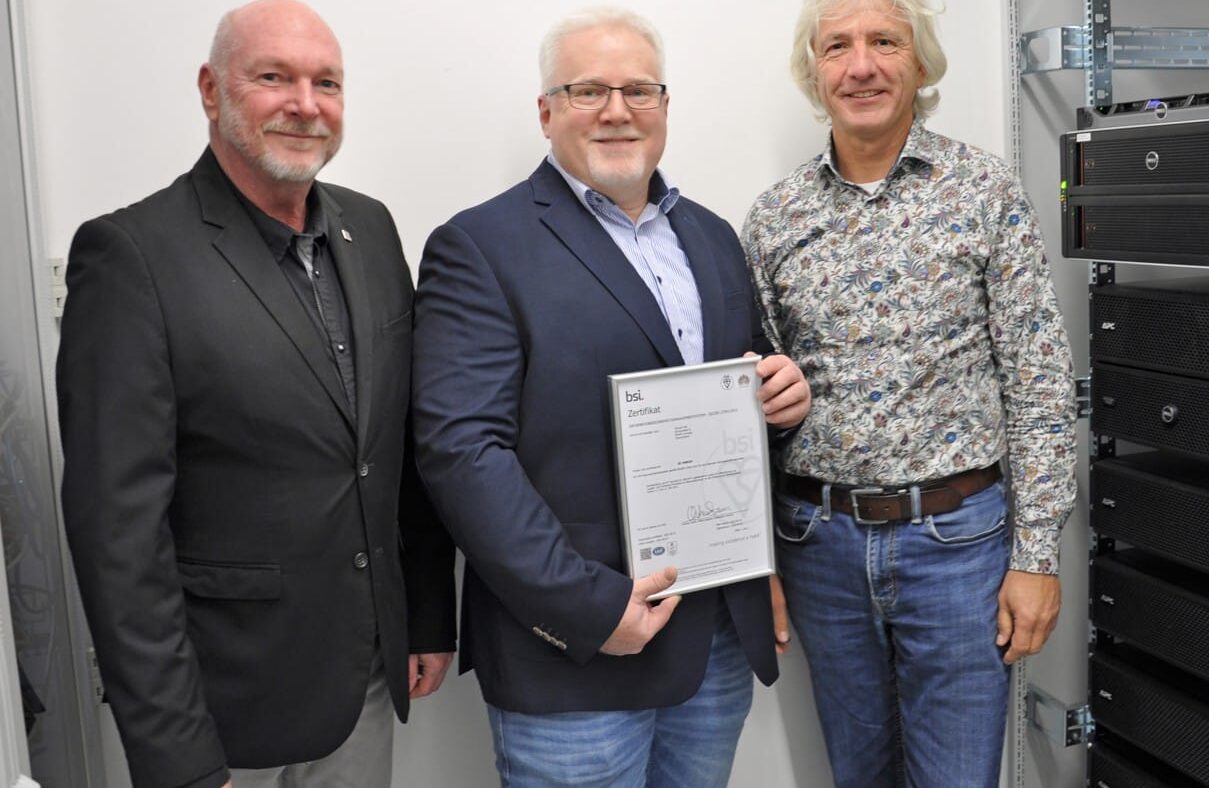 Foto: © GROUP7 / Legenda da imagem: Equipe do projeto 27001 da GROUP7, da esquerda para a direita: Klaus Spielmann, procurador e chefe do departamento jurídico, Thomas Wiederspahn, chefe de gestão da qualidade, Carsten Cramer, engenheiro de sistemas de TI