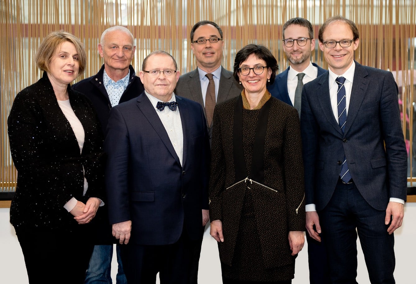 Foto: © RailCom / Legenda da imagem: A diretoria da RailCom (da esquerda para a direita): Anna Ciaranfi Zanetta (membro), Werner Grossen (membro), Peter Bösch (membro), Giuliano Montanaro (membro), Patrizia Danioth Halter (presidente), Christof Böhler (chefe técnico), Prof. Dr. Markus Kern (vice-presidente)