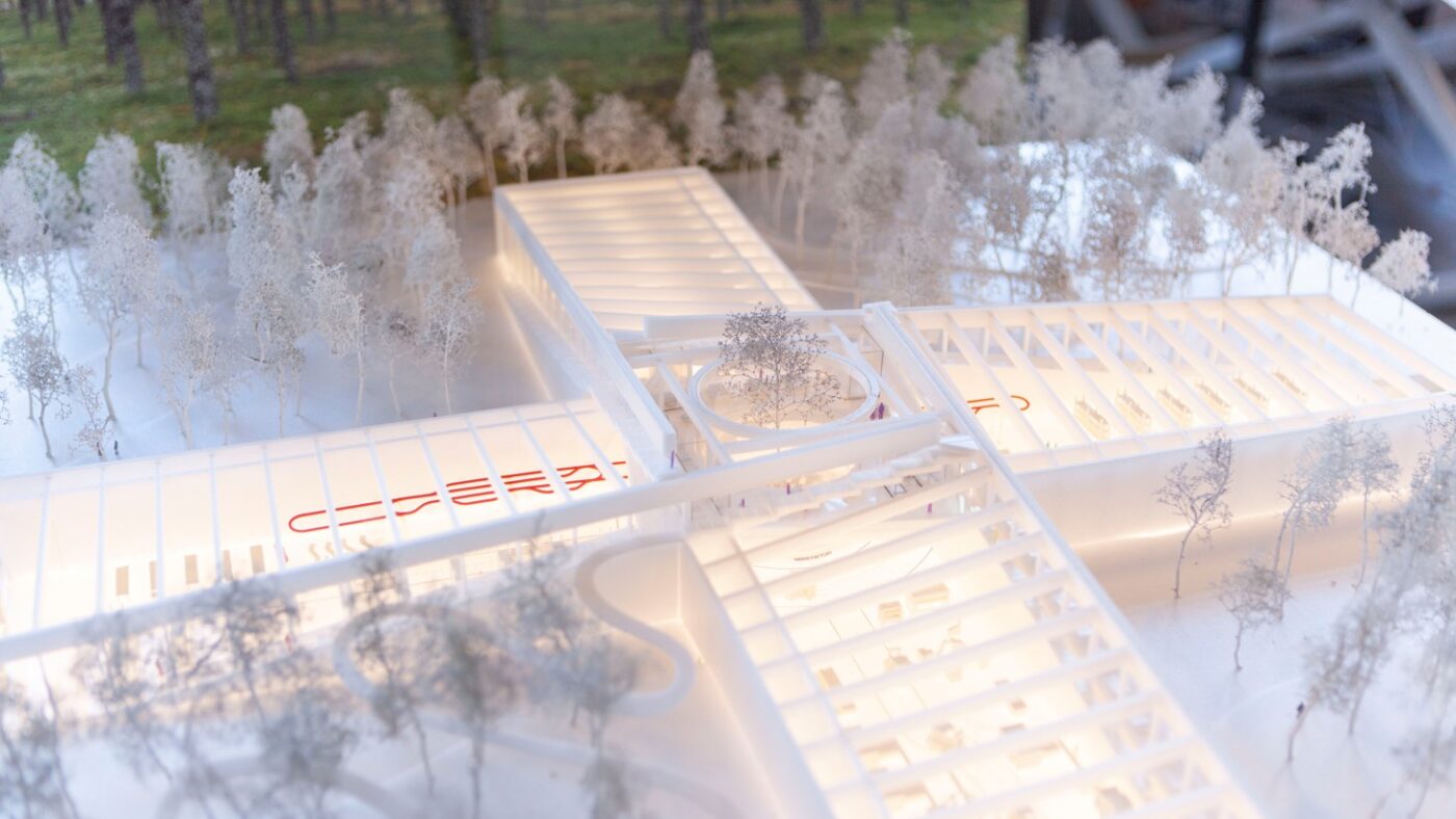Vestre e BIG compartilharam o desejo de um edifício que seja econômico, sustentável e social ao mesmo tempo. Nesse ponto, a ideia nasceu de embutir a fábrica diretamente em uma floresta de pinheiros plantada, tornando tanto o edifício quanto os 300 hectares de floresta acessíveis como um local de experiência para todos. Os visitantes podem conhecer a fabricação de móveis em visitas guiadas, aprender sobre geração de energia, recuperação, tratamento de água ou os ciclos de vida dos materiais. Ao mesmo tempo, as pessoas devem vivenciar o recurso floresta e têm a oportunidade de fazer piqueniques e acampar. O que é especial em toda a geometria do edifício The Plus é que, ao redor, através das enormes fachadas de vidro, é possível olhar diretamente para a produção, como se fossem grandes vitrines. E há muitos acessos à fábrica mais aberta e transparente do mundo. Por exemplo, duas escadas de fachada de 150 metros de comprimento, que se movem linearmente em direções opostas, levam ao telhado de 6.350 m², de onde não apenas as alas do edifício em forma de cruz são visíveis, mas também o pátio central redondo com sua única árvore de bordo. Uma escada circular leva até lá. Quem quiser se divertir pode optar pela escorregadeira curva do telhado para baixo.