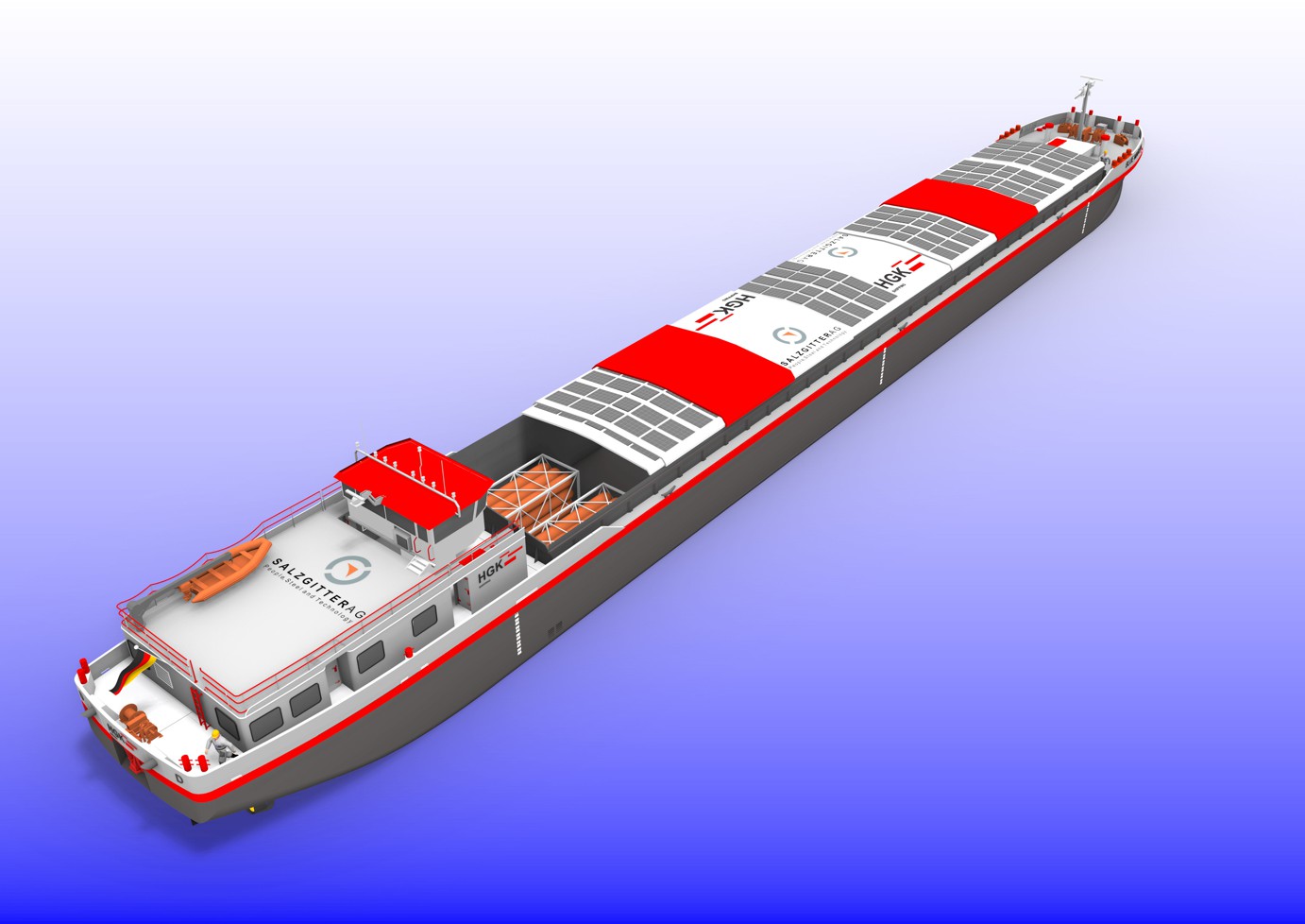 O conceito do navio de carga seca para a cadeia de fornecimento de aço foi desenvolvido e finalizado pela equipa do HGK Shipping Design Centers. Com propulsão diesel-elétrica, o navio foi projetado de forma a poder ser adaptado a sistemas de propulsão e tipos de combustível inovadores. Entre outras opções, existe a possibilidade de instalar um espaço vazio na seção central do navio no futuro. Além disso, painéis solares serão instalados nas coberturas das escotilhas para gerar energia elétrica neutra em termos climáticos e, pela primeira vez, integrar essa energia não só na rede elétrica a bordo, mas também na linha de propulsão. Em suas dimensões, design e configuração do espaço de carga, o navio de carga está explicitamente orientado para as necessidades da Salzgitter AG. Com um comprimento e largura de 86 x 9,5 metros, o navio é capaz de transportar 1.535 toneladas. Ele será utilizado no tráfego regular entre os locais da Salzgitter e os clientes na Holanda e na Bélgica, para transportar produtos de entrada e saída de aço, como sucata de aço.