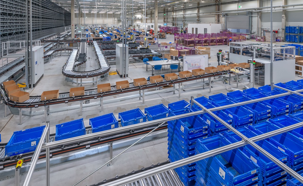 Para a separação de pedidos de envio e sua embalagem, foram estabelecidos postos de trabalho para a separação e embalagem de envio. Além disso, três estações de trabalho foram instaladas na área de recebimento de mercadorias. Para a interconexão do AKL e dos postos de trabalho de armazenamento, separação e embalagem, projetados de acordo com os melhores aspectos ergonômicos e ajustáveis em altura, a Inther implementou um conceito dinâmico de tecnologia de transporte inteligente, incluindo um buffer de recipientes vazios. Em circuitos em trilhos de transporte especiais para recipientes de origem, recipientes de destino e caixas de envio, a tecnologia de transporte atende as estações de trabalho a uma velocidade de 0,8 m/s.