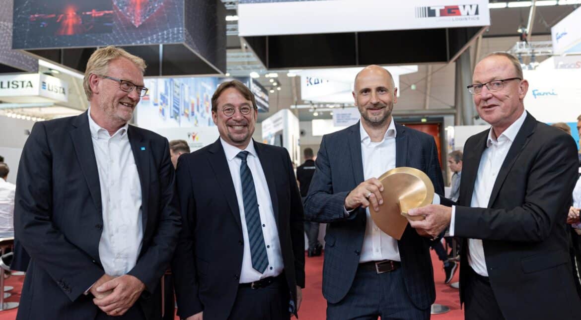 Foto: © TGW / Bildlegende: (v.l.n.r.) Jean Haeffs (Geschäftsführer der VDI-Fachgesellschaft Produktion und Logistik), Prof. Johannes Fottner (Stellvertretender Vorsitzender der Jury), Christoph Wolkerstorfer (CSO TGW Logistics Group) und Gregor Blauermel (Vorsitzender der Jury)